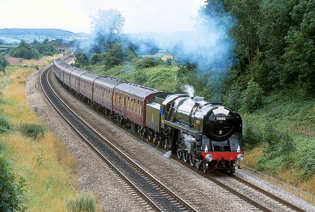 25/07/93:- "Britannia" accelerates "The Cotswold Venturer" railtour northwards from Standish Junction.