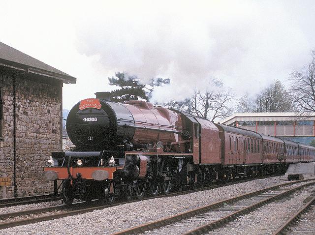 27/03/94:- 46203 "Princess Margaret Rose" storms through Chepstow running 30 minutes late with a Didcot - Crewe charter.