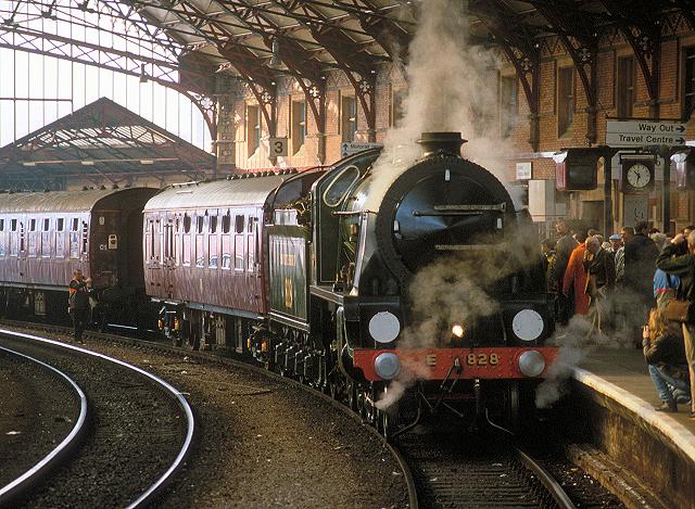 08/10/94:- 828 and its support coach backs onto the Exe Parrett railtour under the overall roof at Bristol Temple Meads.