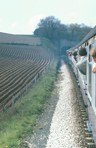 26/04/80:- The Penzance Pullman climbs the last few yards on the approach to the summit to Dainton Tunnel.