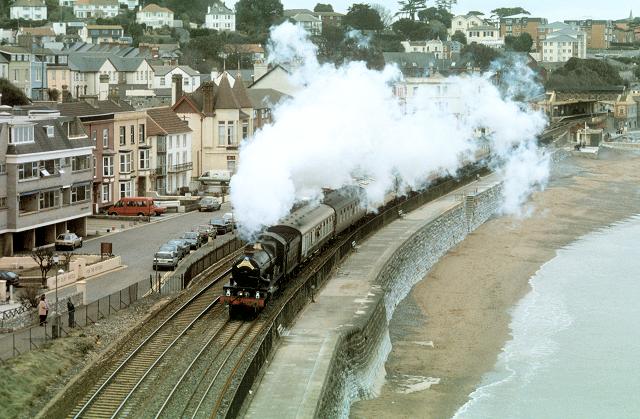 17/02/96:- 5029 skirts the sea wall west of Dawlish as it heads the Mayflower tour towards Plymouth.