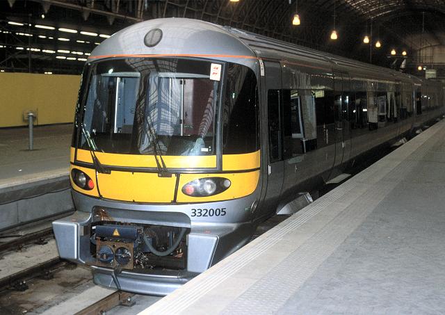22/01/98:- Heathrow Express unit, 332005, at Platform 7, Paddington station ready to depart with the 09.10 service.