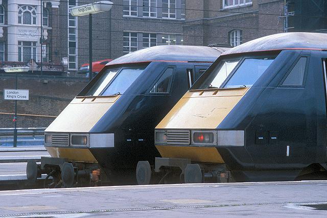 22/01/98:- Front ends of 91001 and 91002 at Platforms 5 and 6, King's Cross station.