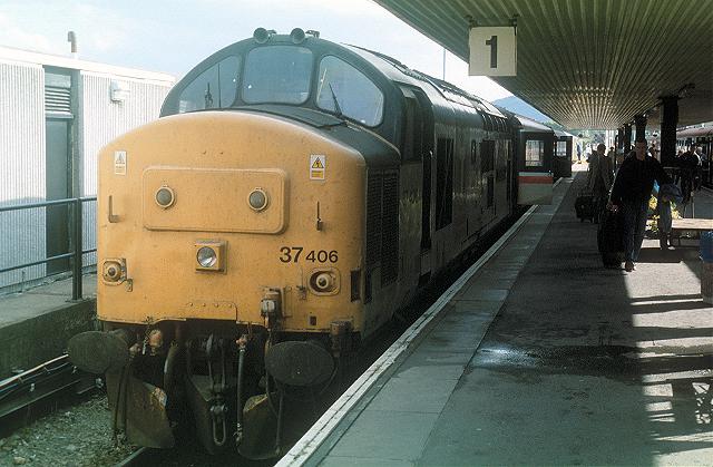 07/09/98:- 37406 stands in Platform 1 at Fort William having arrived at 10.25 with the sleeper service from London.