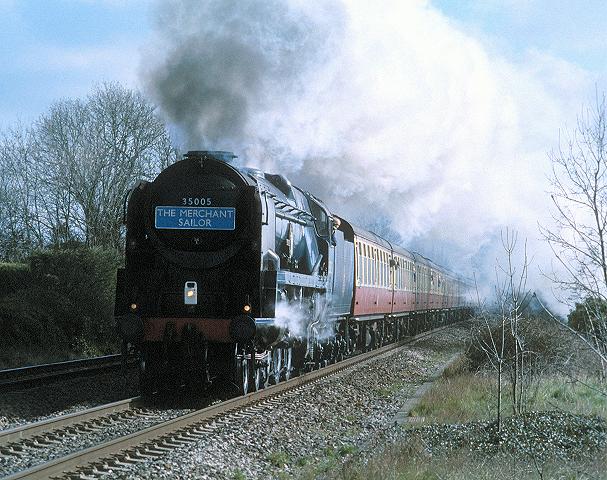 13/03/99:- Merchant Navy Pacific No. 35005 "Canadian Pacific" working hard as it approaches Steventon Crossing with the "Merchant Sailor" railtour.