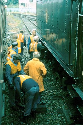 02/07/2000:- All hands to the pump. A sterling effort by the 60532 support crew see the tender spring replaced during the servicing stop at Exeter..