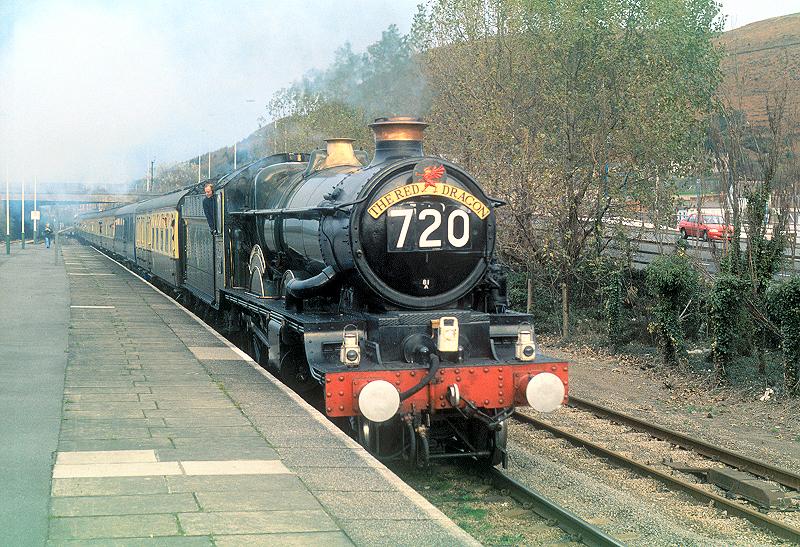 10/11/01:- 5029 "Nunney Castle" arrives for its station call at Port Talbot with the London bound Red Dragon express.