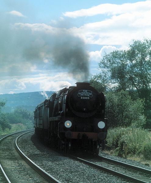 20/07/02:- 35005 accelerates hard as it departs from Lydney at Naas Crossing with the Gloucester Meteor railtour.