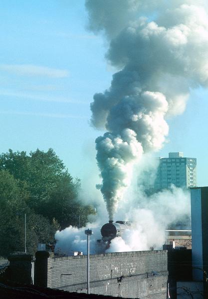 19/10/02:- LMS Pacific No. 6301 "Princess Elizabeth" departs Barton Hill depot in clouds of steam to pick up The Mayflower railtour from Bristol to Plymouth.