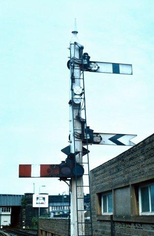 7/7/80:- Economical use of signal posts at Skipton station, Up Starting, Down Home and Distant on one post.