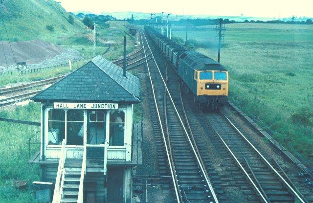 11/7/80:- An unidentified Class 47, heads a loaded coal train past Hall Lane Junction signal box.