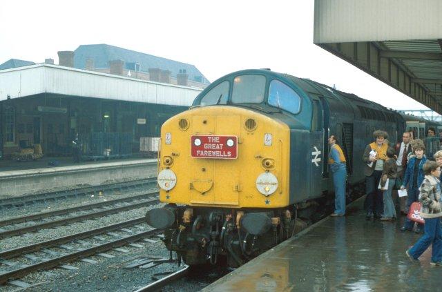 20/9/80:- 40111 stands at a very wet Doncaster station for a photo-stop on the RPPR "Great Farewells Railtour".