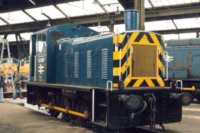 05/10/80:- Class 03, 03189 stands on display inside Barrow Hill roundhouse.