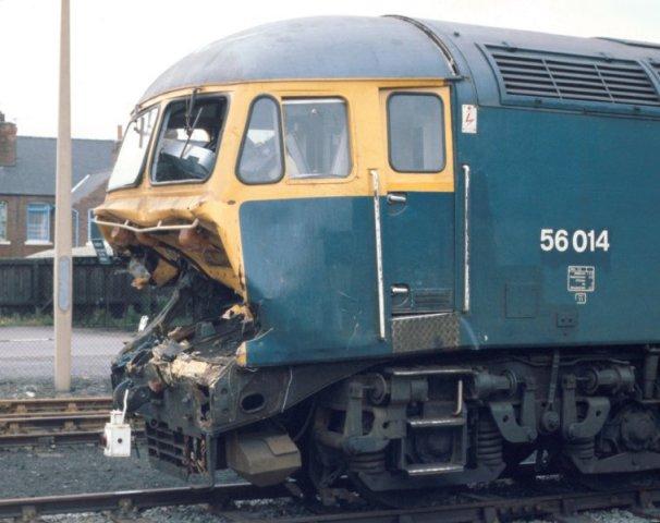 5/10/80:- Front end of accident damaged 56014 awaiting attention in Doncaster Works yard.