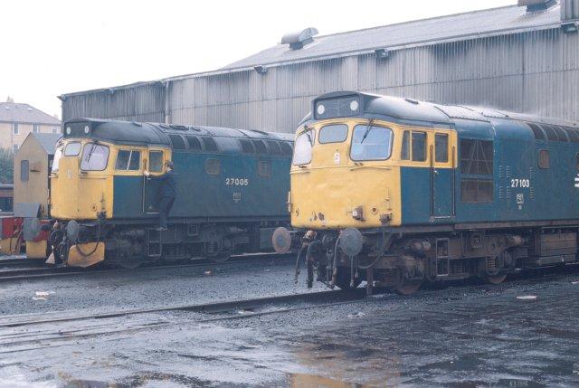 21/03/81:- 27005 and 27103 stand outside the main depot buildings at Eastfield depot.