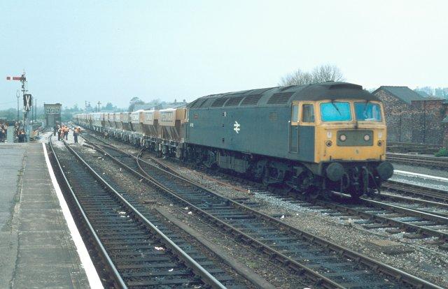 13/4/81:- 47122 heads a Yeoman stone train through Salisbury whilst work proceeds on the resignalling of the station.