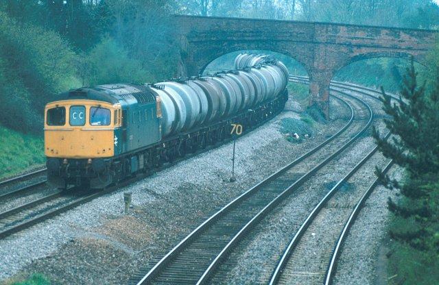 13/4/81:- 33030 on a down oil tanker train at Wilton Junction on the Westbury route.