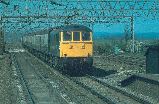 18/4/81:- An unidentifed Class 86 speeds a London bound express through Cheddington station on the fast lines.