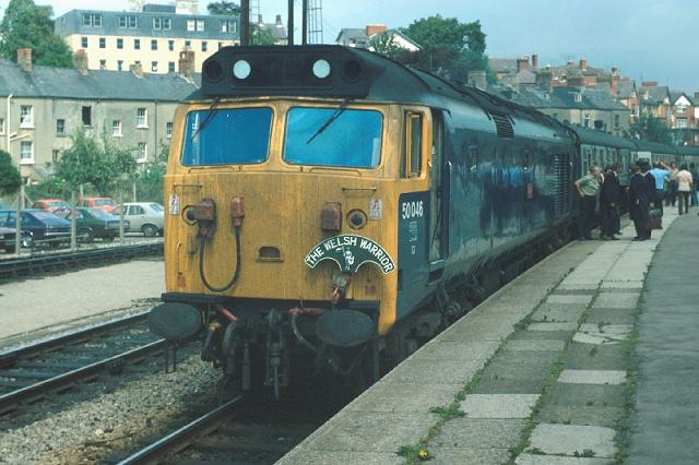 12/08/79:- 50046 "Ajax" with train headboard stands in the platform at Newport.