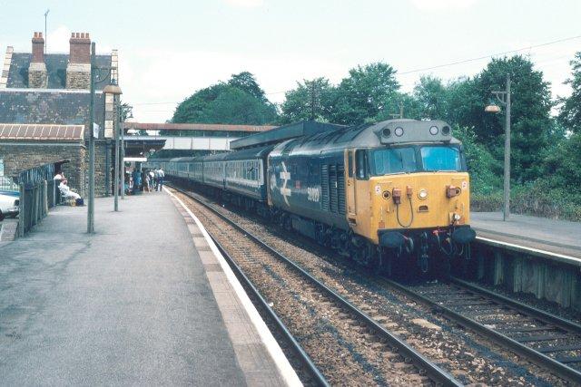 27/07/81:- Refurbished 50020 "Revenge" arrives at Sherborne station with a morning Exeter St. David's service.