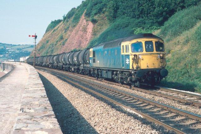 28/07/81:- 33102 heads an eastbound oil train along the sea wall near Teignmouth.