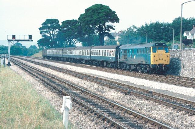 28/07/81:- An unidentified Class 31 heads five Mk1 coaches and a van on a Paignton service approaching Aller Junction.