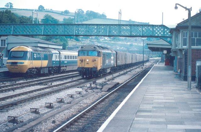 30/07/81:- 50036 on an Up van train passes a down HST calling at Totnes station.