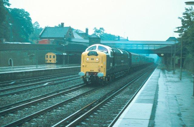 17/10/81:- 55015 "Tulyar" speeds through a very wet Weybridge station on the Wessex Deltic railtour.