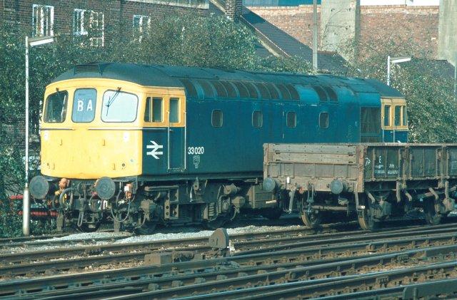18/10/81:- 33020 stands in the loco siding at the west end of Woking station.